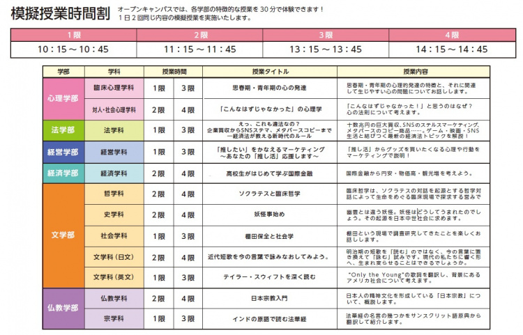 模擬授業に参加希望の方は当日配布のパンフレットで教室をご確認いただき、直接会場へお越しください。